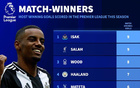 本賽季英超制勝球排行:伊薩克、薩拉赫9球居首,伍德8球第三